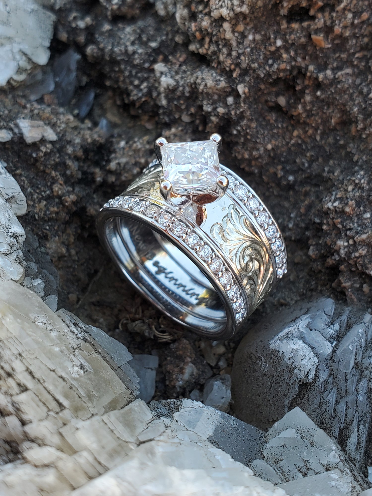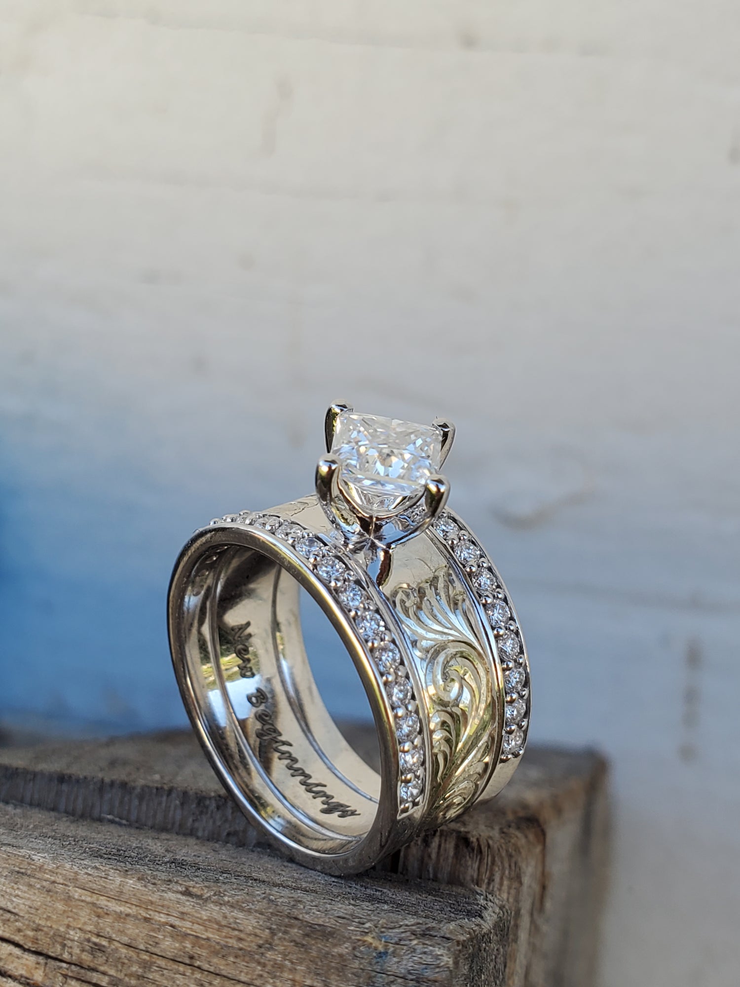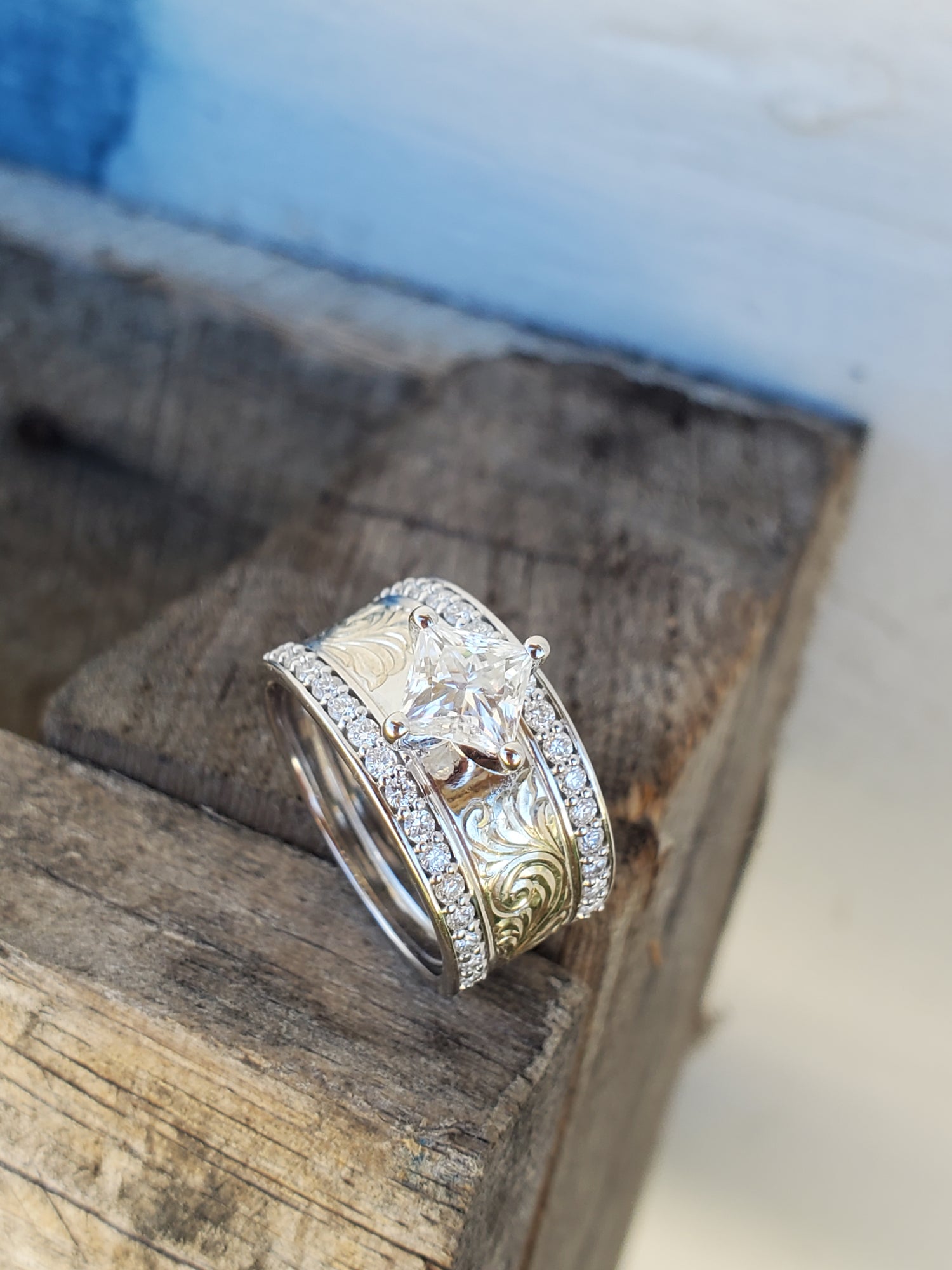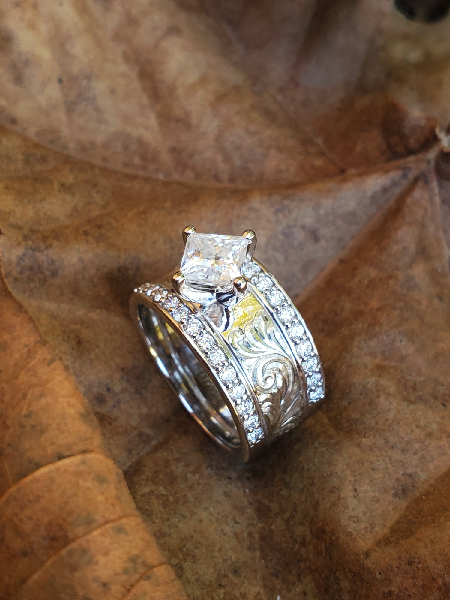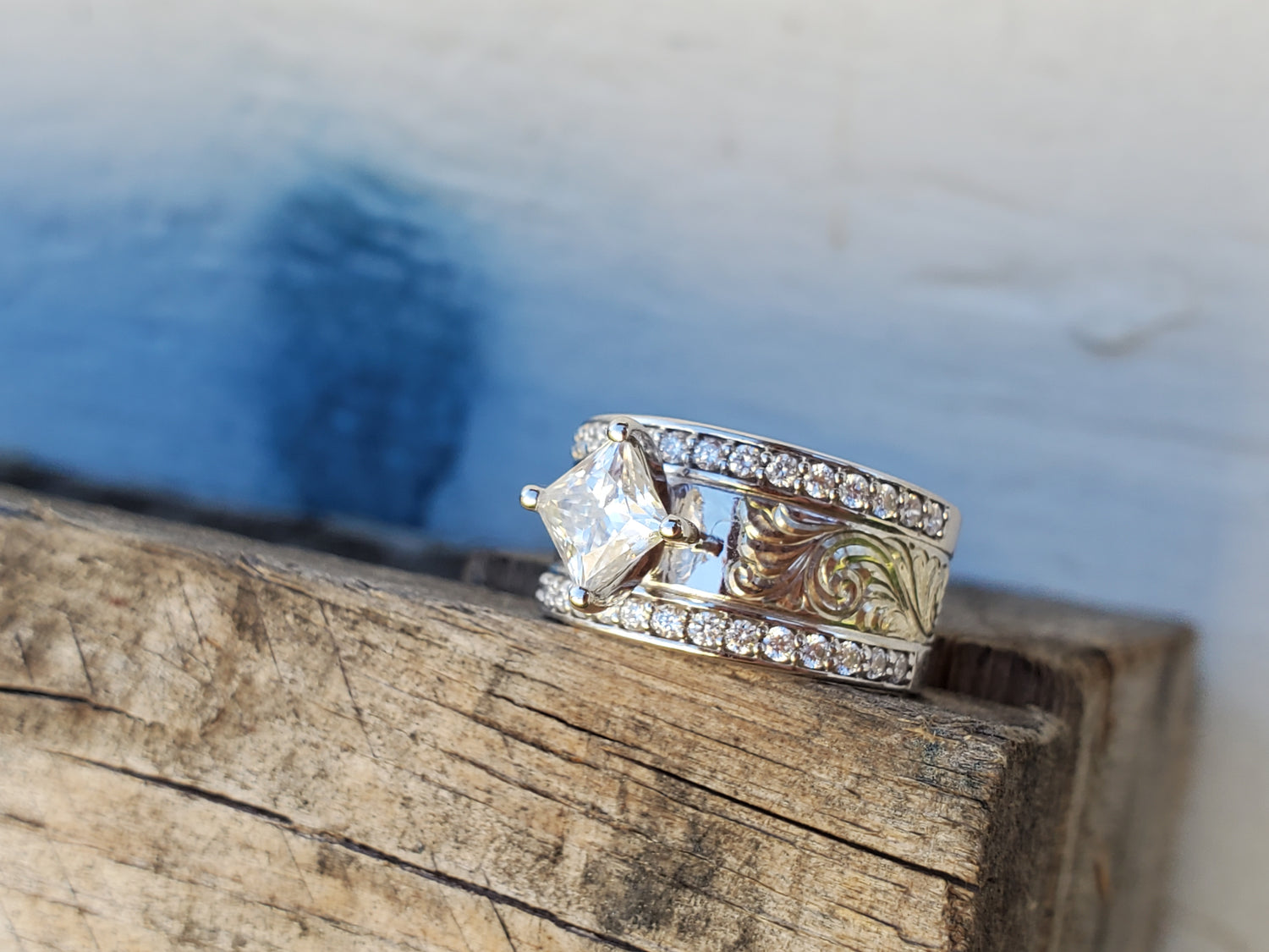 The ring is made out of 10K white gold and the center features beautiful hand-engraving. The engraving is framed in with sparkling channel-set lab diamonds that go about halfway down the band. The setting is where this ring really shines: the square 1 ct. Center stone (DEF lab diamond or moissanite) is set diagonally.