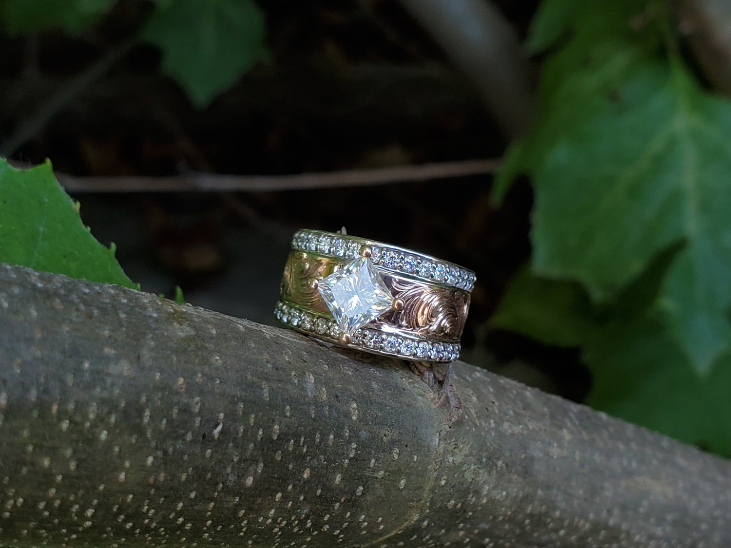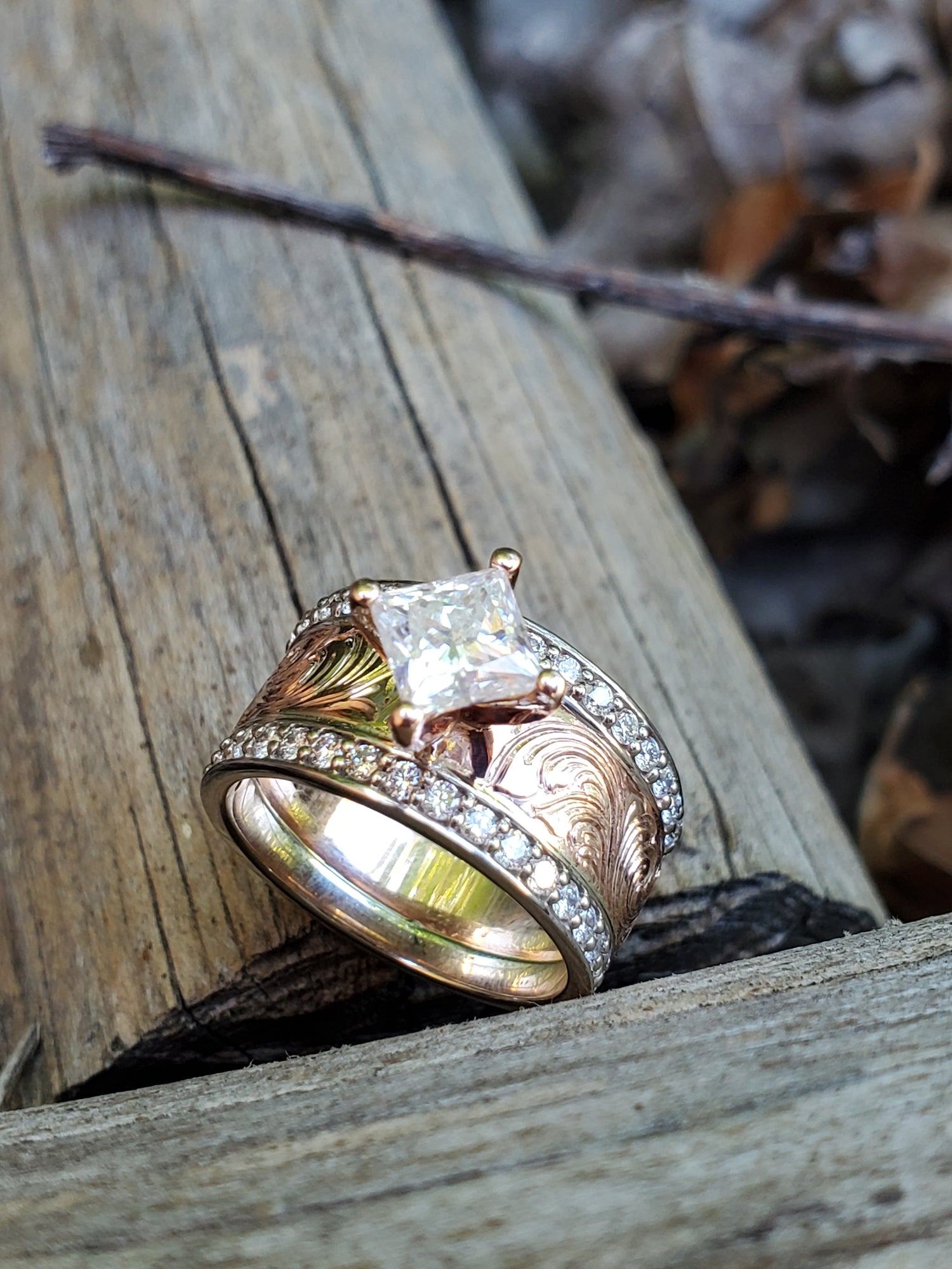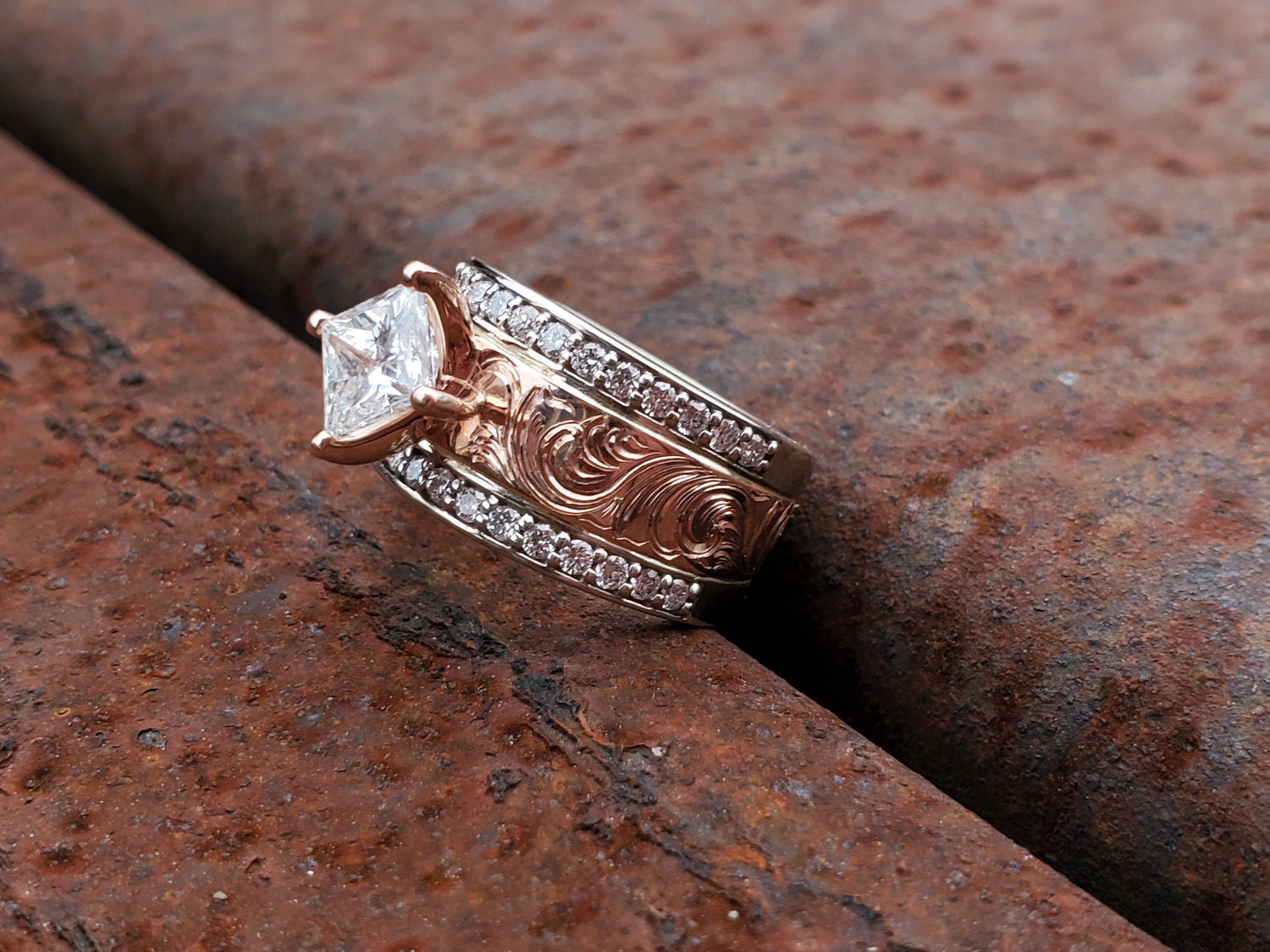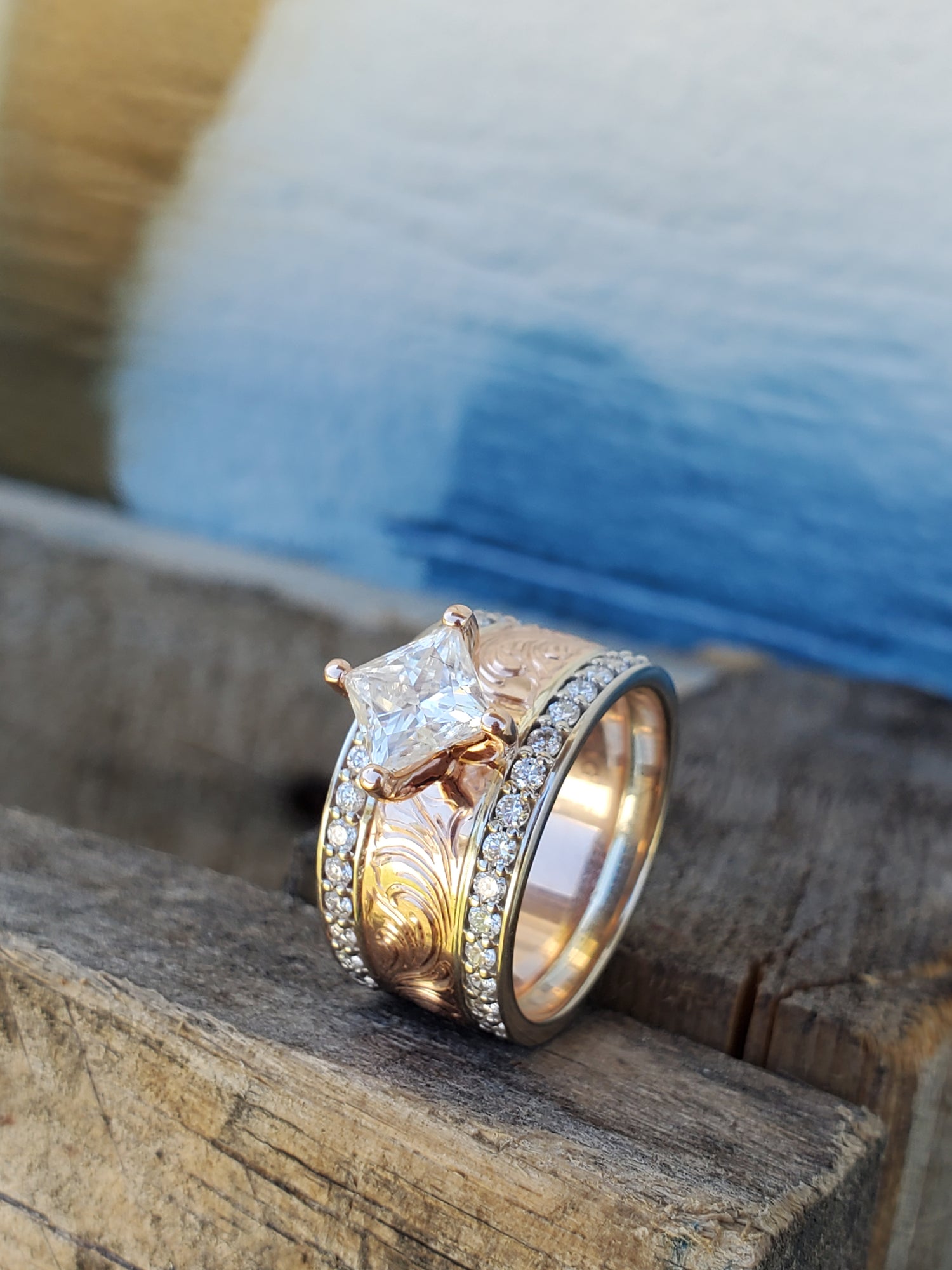 The ring is made out of 10K rose gold and the center features beautiful hand-engraving. The engraving is framed in with sparkling channel-set lab diamonds that go about halfway down the band. The setting is where this ring really shines: the square 1 ct. center stone (DEF lab diamond or moissanite) is set diagonally, adding a unique twist.