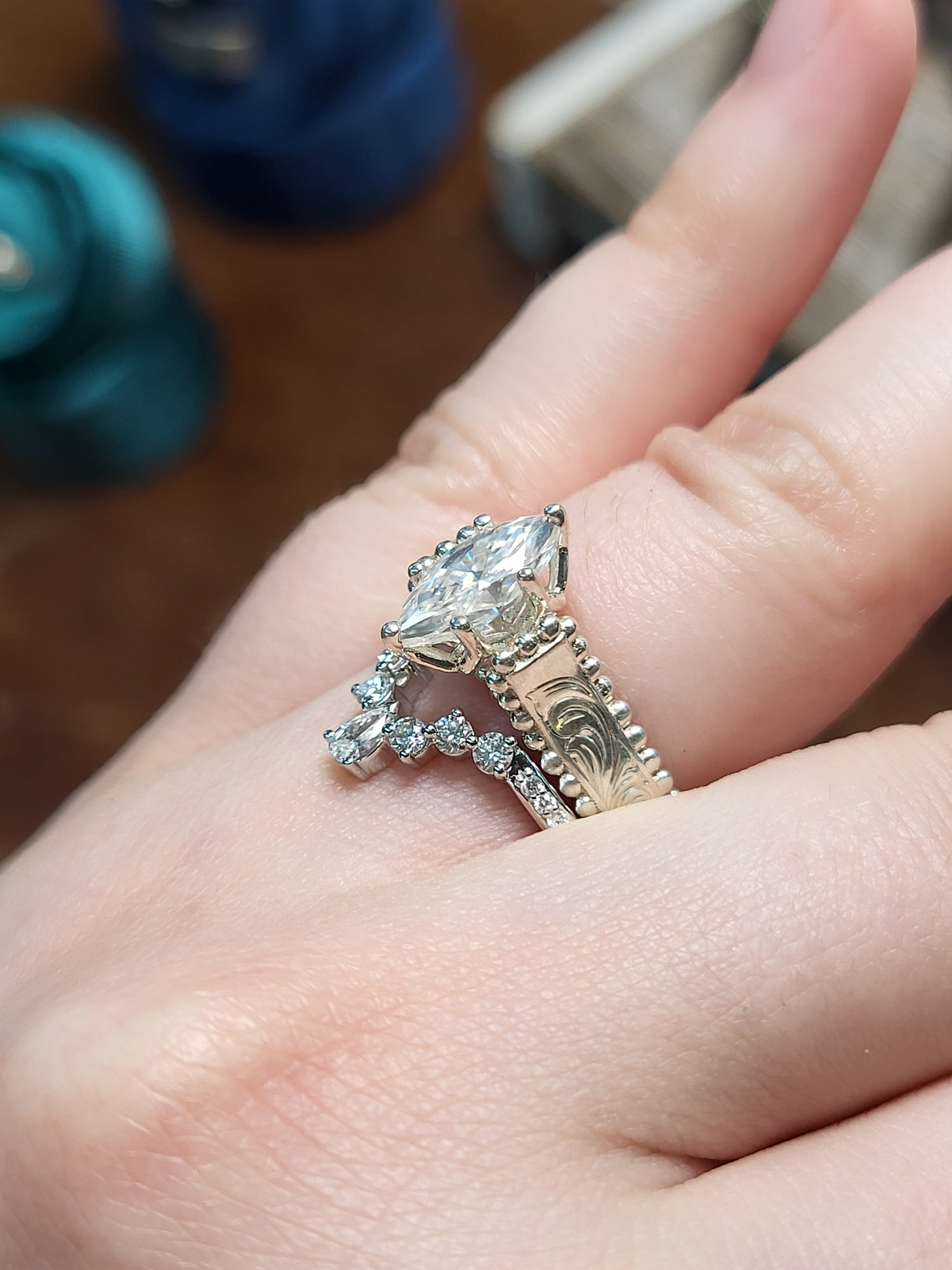 The back and sides of the band are a rope pattern, tying together other Western details in your bridal stack perfectly.
