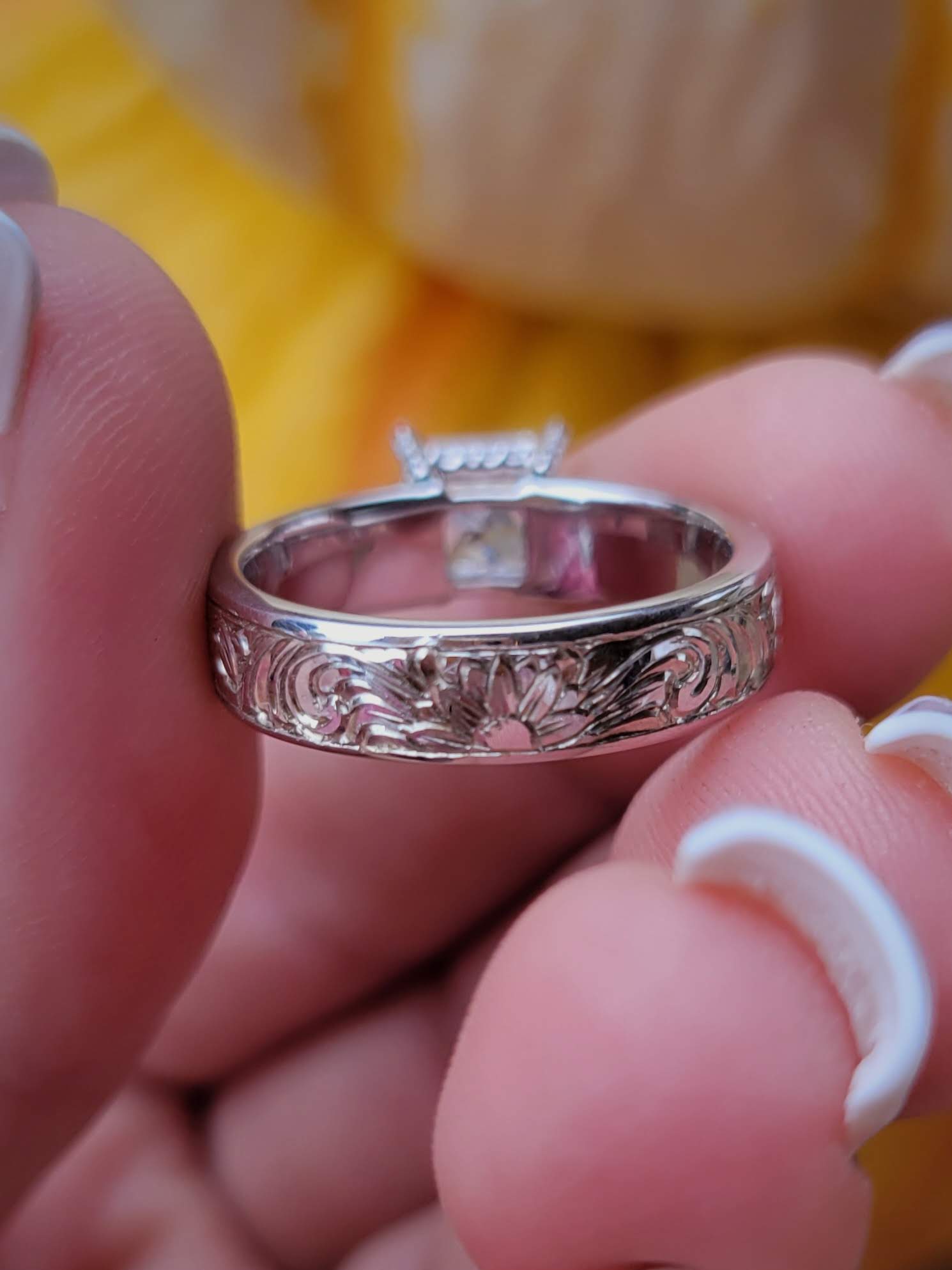 We make each piece one at a time, for every order. Because of this, your final piece may vary slightly from the picture and the engraving style may be adjusted slightly to fit your ring size or customizations.