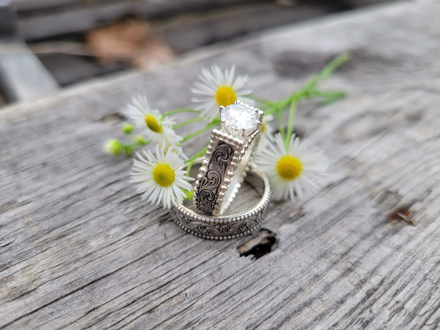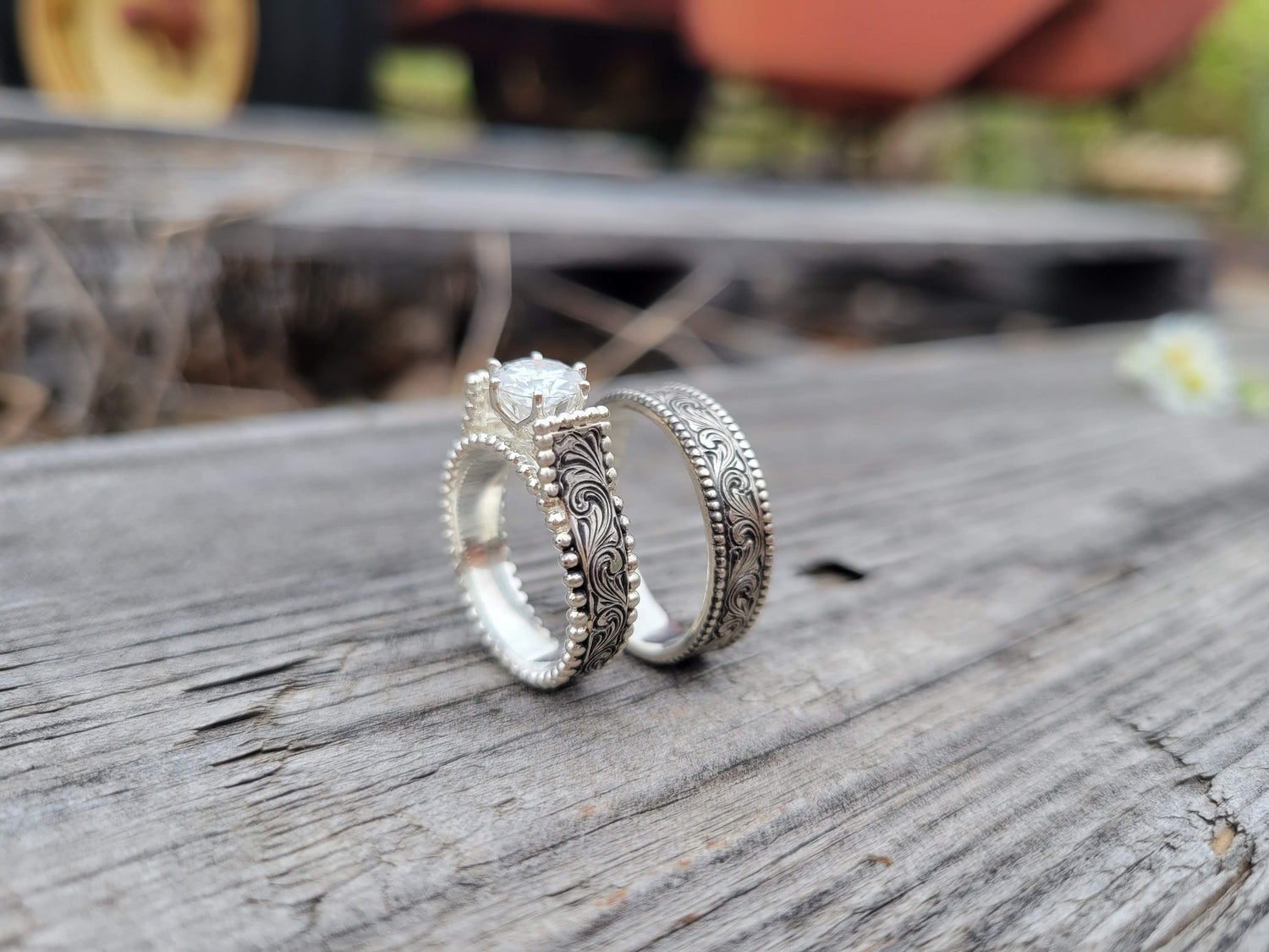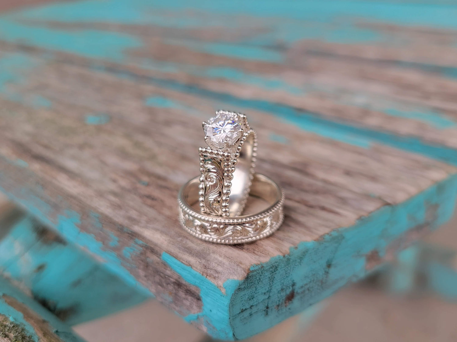 -First, the gorgeous Western engagement ring that features a cathedral-style band and a sparkling moissanite center setting. It has a hand-engraved sterling silver band and a gorgeous sterling silver bead edge.