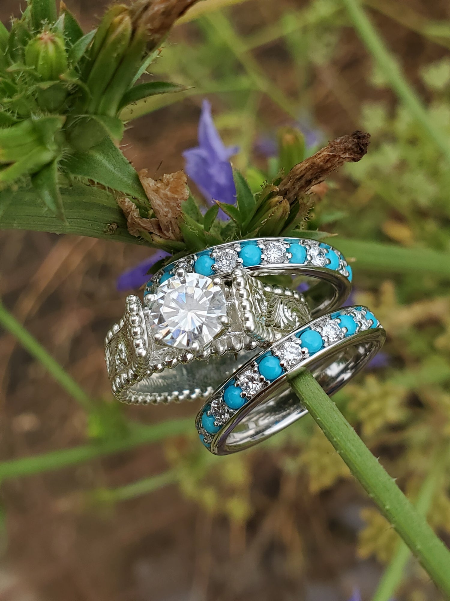 This ring is available in sterling silver, 10K, or 14K white gold and has a hand-engraved band and bead edge halfway around that leaves room for the bead ring (which you can have attached or leave detached to use as a wedding band- will be attached by default unless specified).