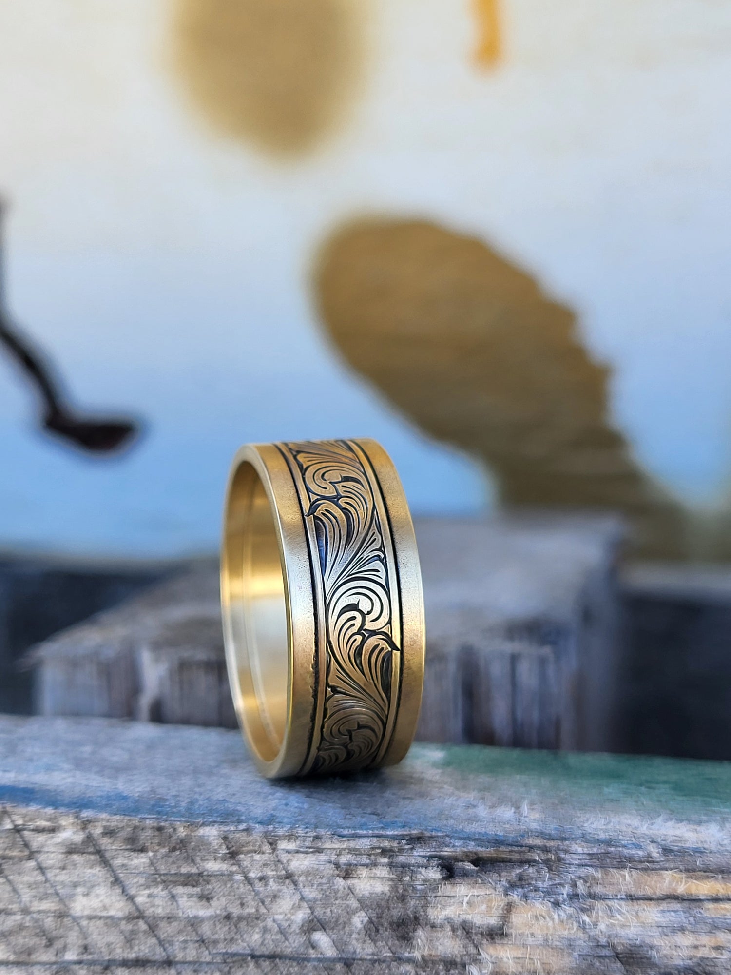 The Tyler: 8mm, 10K, 14K or 18K Yellow Gold Men's Western Wedding Band, Custom Engraved Initial, Hand-Engraved Cowboy Wedding Ring, Men's Engraved Wedding Band, 8mm Wedding Band for Men, Yellow Gold Men's Ring