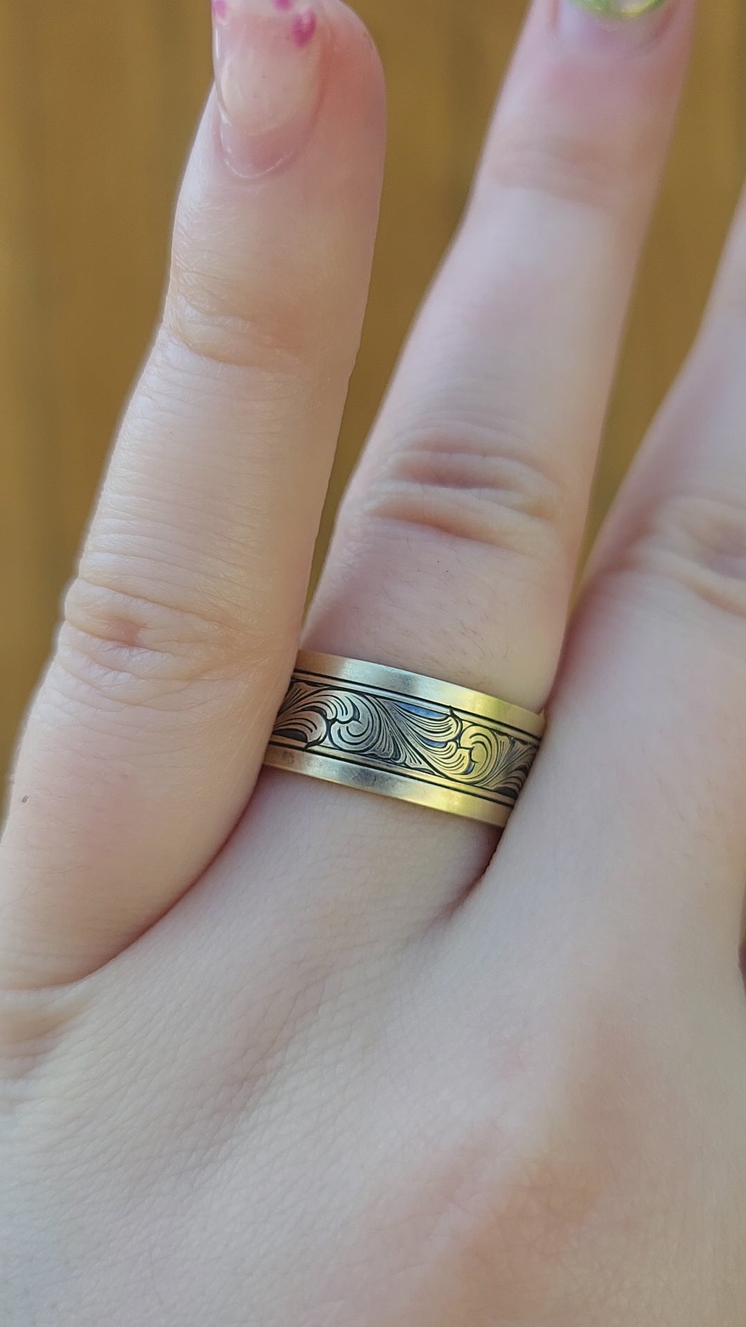 Our small team makes everything one at a time for every order. Because of this, your final piece may vary slightly from the picture and the engraving style may be adjusted slightly to fit your ring size or customizations. Please allow ample time for shipment. Check the banner at the top of the page to see our current turnaround time.