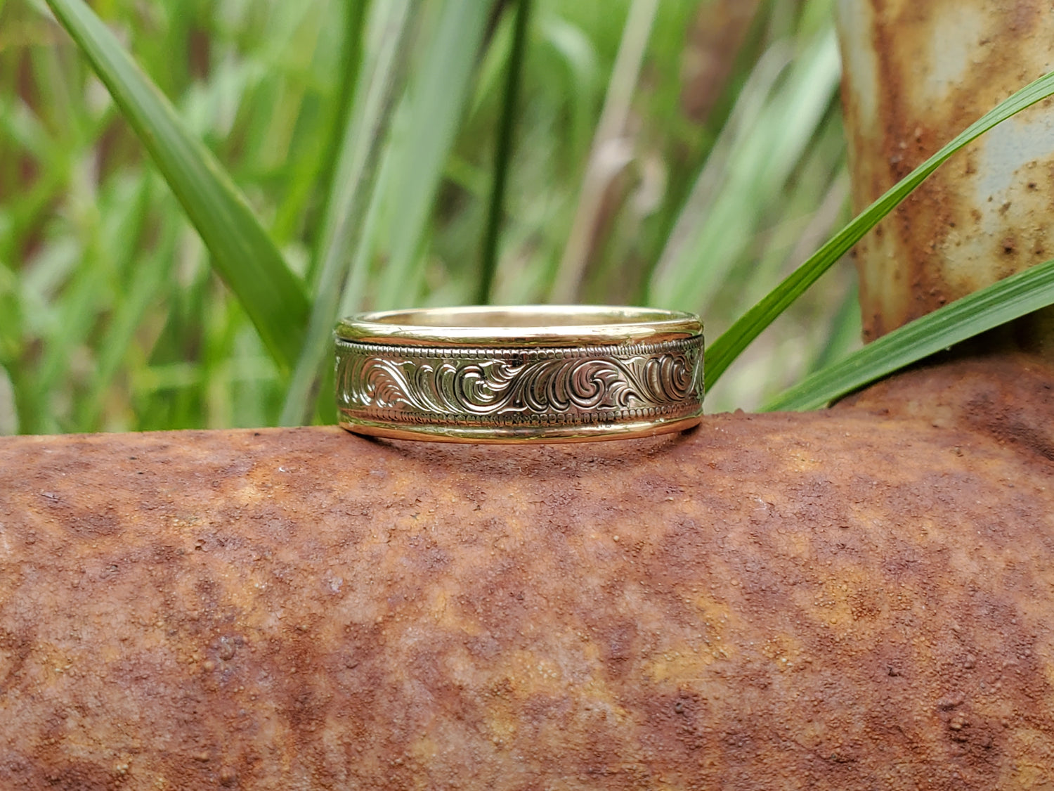 This band is around 6mm wide, with rounded contrasting 10K yellow gold edges and an engraved 4mm 10K white gold center section. The hand-engraved scrollwork is intricate and stunning!