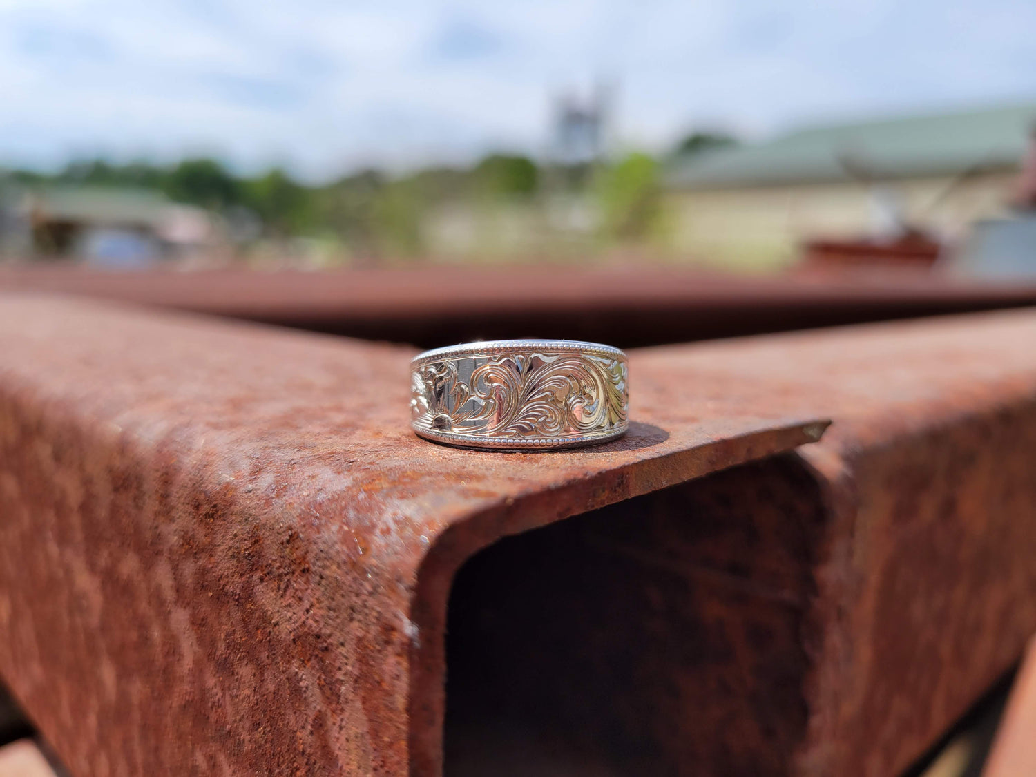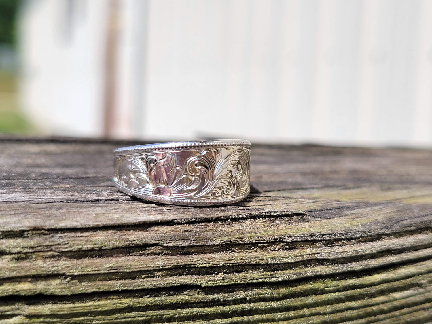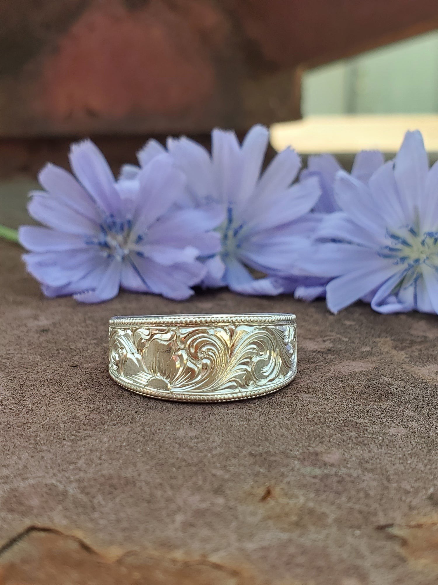 Need a classy everyday ring to add to your wardrobe? Check out this beautiful engraved floral and swirl 10k white gold or sterling silver band.